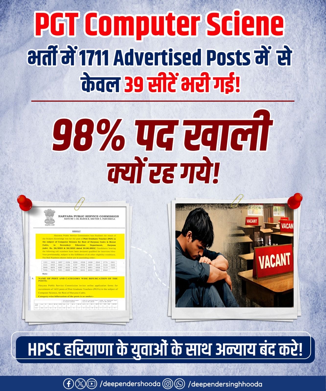चंडीगढ़, 5 फरवरी। सांसद दीपेन्द्र हुड्डा ने कहा कि HPSC सिलेक्शन की बजाय हरियाणवी युवाओं के लिए रिजेक्शन कमीशन बन चुका है। पिछले 12 साल से बीजेपी सरकार भर्तियों के नाम पर हरियाणा के युवाओं को ठग रही है। उन्होंने कहा कि वर्षों इंतजार के बाद HPSC PGT Computer Science की 1711 पदों की भर्ती का Result आया तो सिर्फ 39 ही पास हुए, बाकी 1672 पद खाली रह जायेंगे। इससे पहले भी अनेक भर्तियों में पदों को खाली रखा गया।