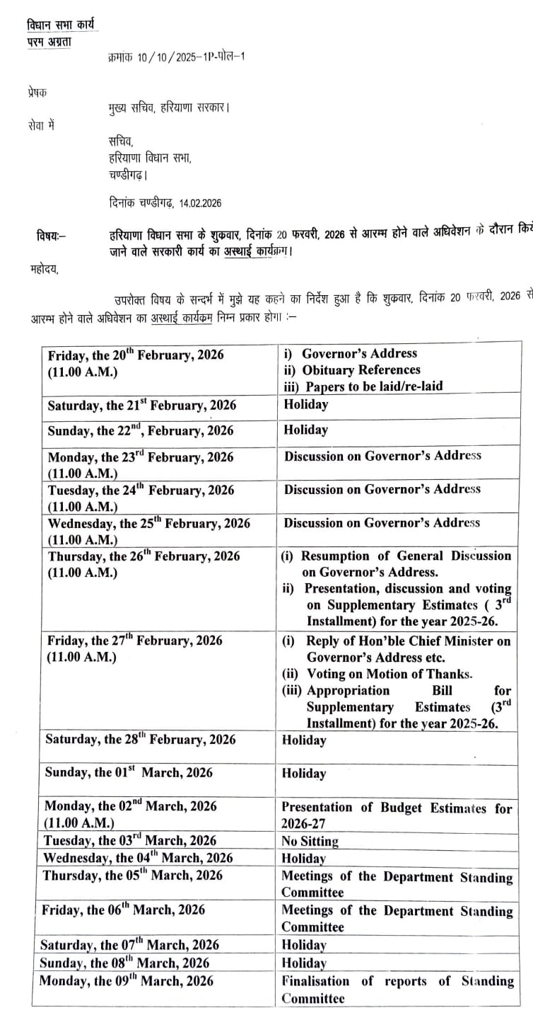 Haryana Budget: हरियाणा में बजट सेशन के लिए शेड्यूल जारी कर दिया गया है। सेशन 20 फरवरी को राज्यपाल के अभिभाषण से शुरू होगा। 2 मार्च को मुख्यमंत्री नायब सिंह सैनी बजट पेश करेंगे।