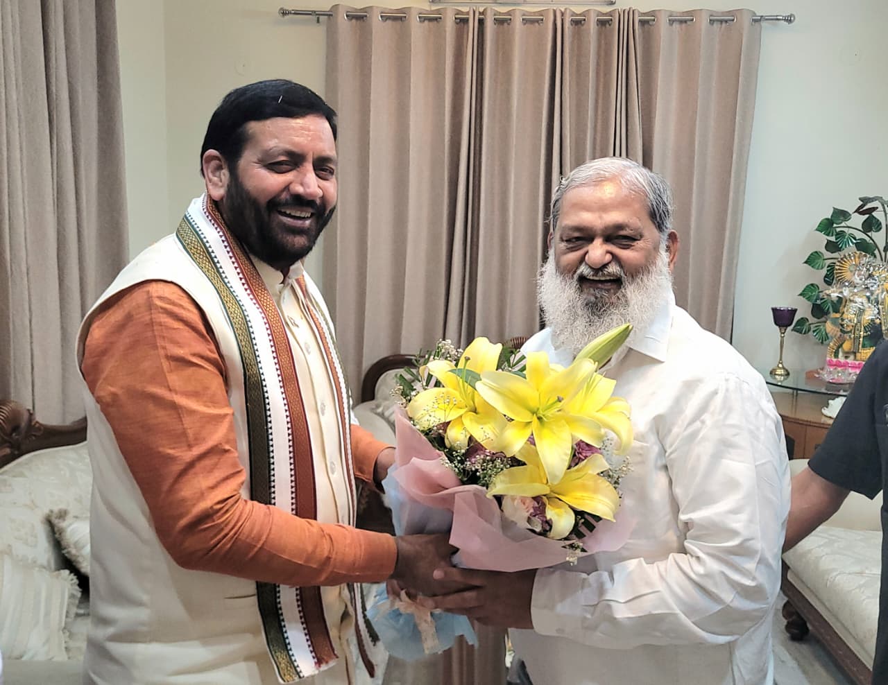 इस दौरान मंत्री श्री अनिल विज ने मुख्यमंत्री श्री नायब सैनी को सम्मानपूर्वक शॉल भेंट की। मुख्यमंत्री श्री नायब सिंह सैनी के आगमन पर श्री अनिल विज, उनके भाई श्री राजिंद्र विज, श्री कपिल विज, गौरव विज, शुभम विज, अतुल महेंद्रू, भारती एवं परिवार के अन्य सदस्यों ने मुख्यमंत्री का स्वागत किया। पारिवारिक आत्मीयता के माहौल में हुई इस भेंट ने आपसी विश्वास और सहयोग की भावना को और मजबूत किया।इस अवसर पर पूर्व मंत्री श्री असीम गोयल, भाजपा नेत्री श्री बंतो कटारिया आदि मौजूद रहे।