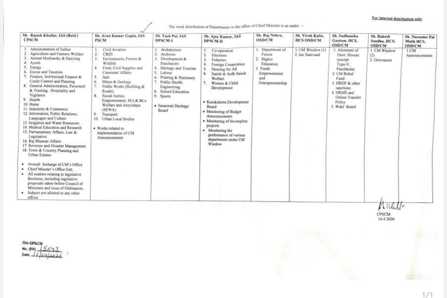 हरियाणा में मुख्यमंत्री नायब सिंह सैनी के नेतृत्व में मुख्यमंत्री कार्यालय (CMO) के अधिकारियों के बीच कार्य विभाजन को अंतिम रूप दे दिया गया है। इस संबंध में एक आधिकारिक अधिसूचना भी जारी कर दी गई है।