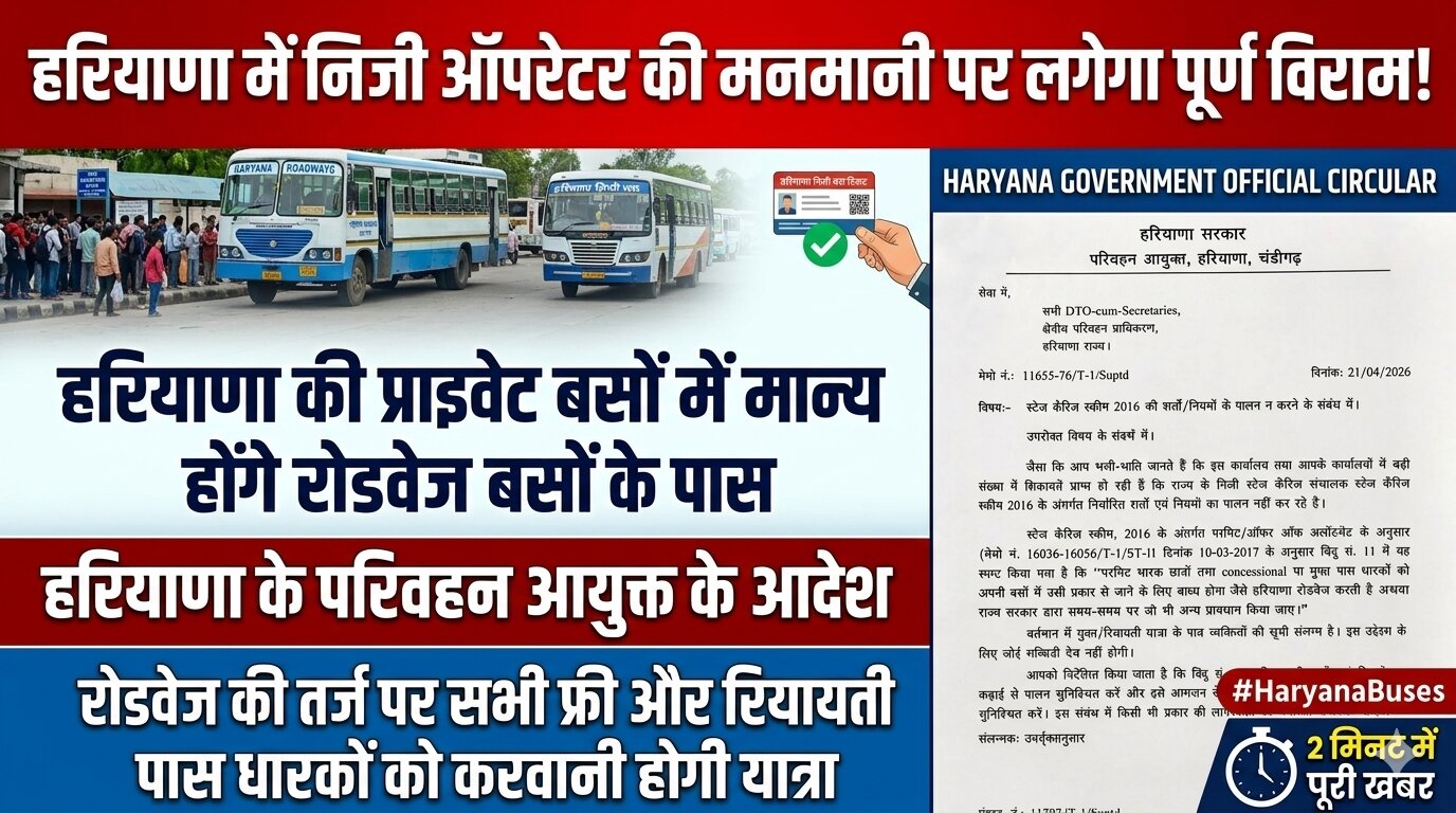 Haryana roadways: हरियाणा में निजी बस ऑपरेटरों की मनमानी खत्म: अब प्राइवेट बसों में भी चलेंगे रोडवेज के फ्री और रियायती पास