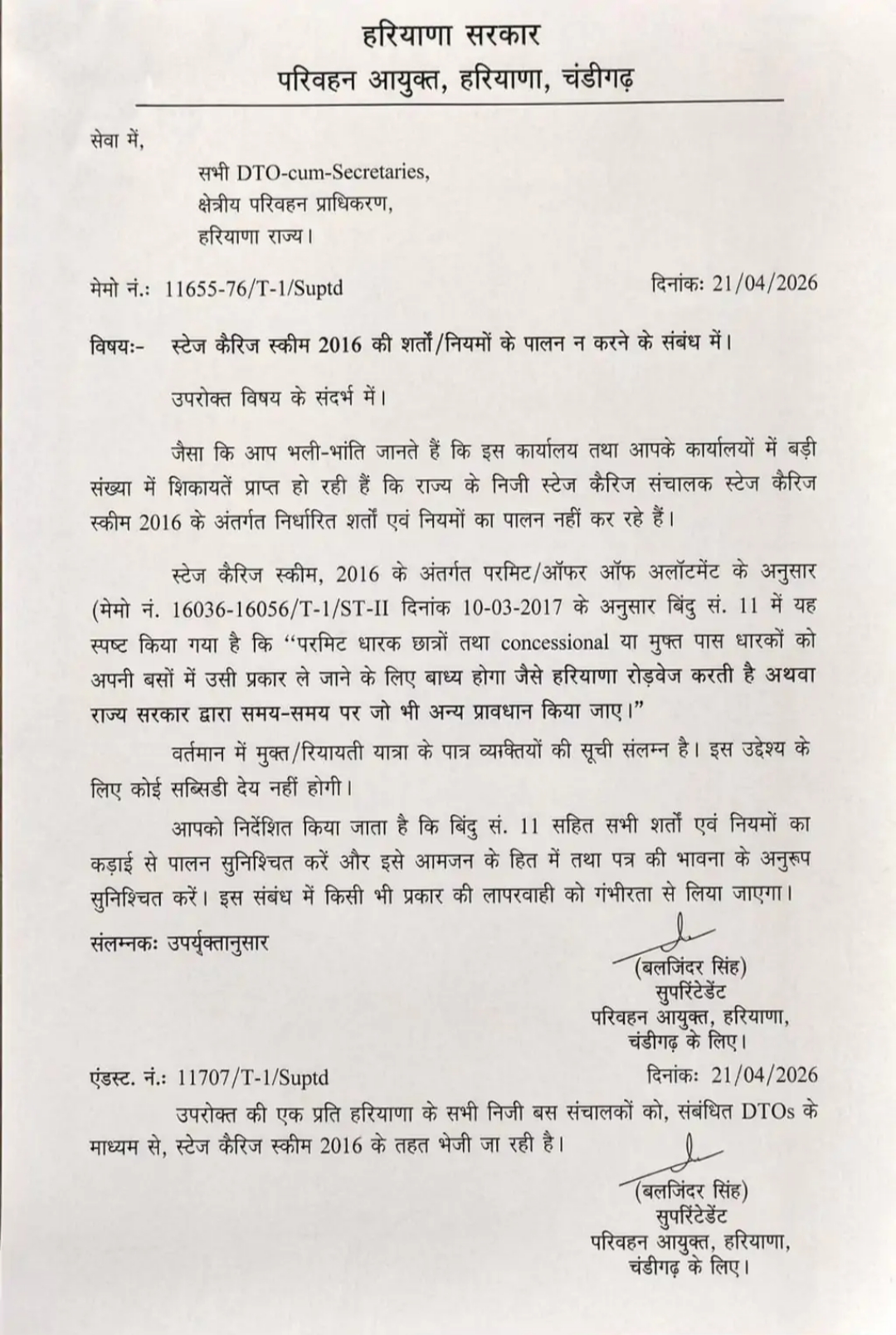 निजी बस संचालकों को रोडवेज की तर्ज पर ही सभी रियायती पास स्वीकार करने होंगे। नियमों का उल्लंघन करने वाले ऑपरेटरों के खिलाफ सख्त कार्रवाई की जाएगी। — परिवहन विभाग, हरियाणा