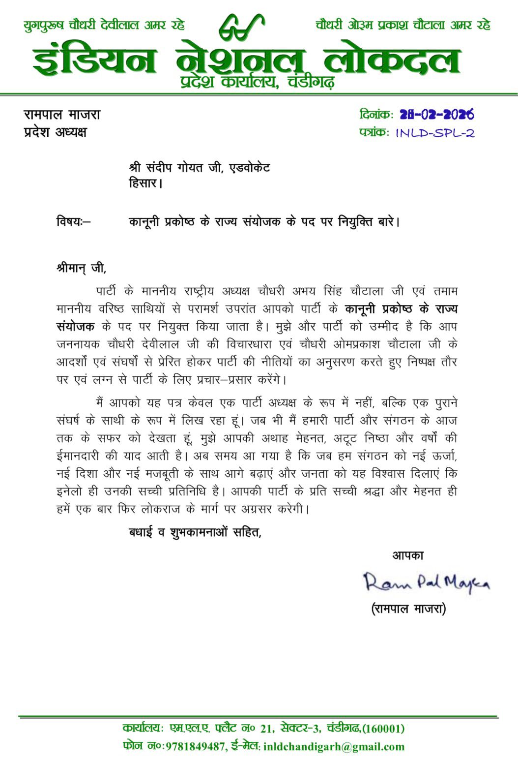 INLD News: एडवोकेट संदीप गोयत को इंडियन नेशनल लोकदल के कानून प्रकोष्ठ का प्रदेश संयोजक किया गया नियुक्त