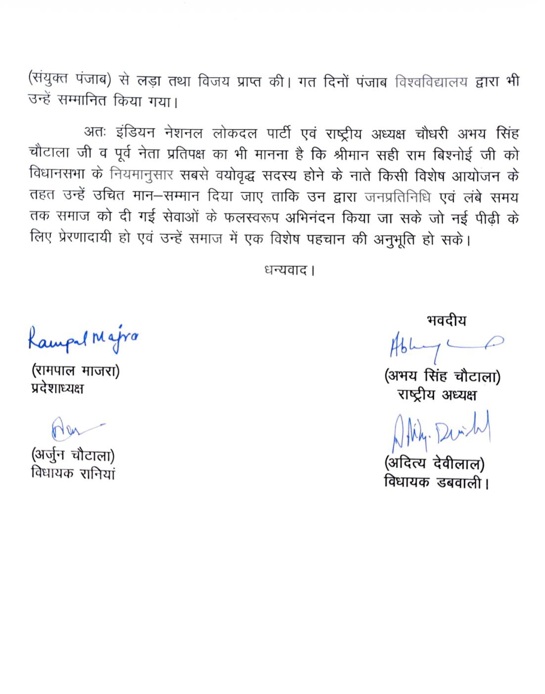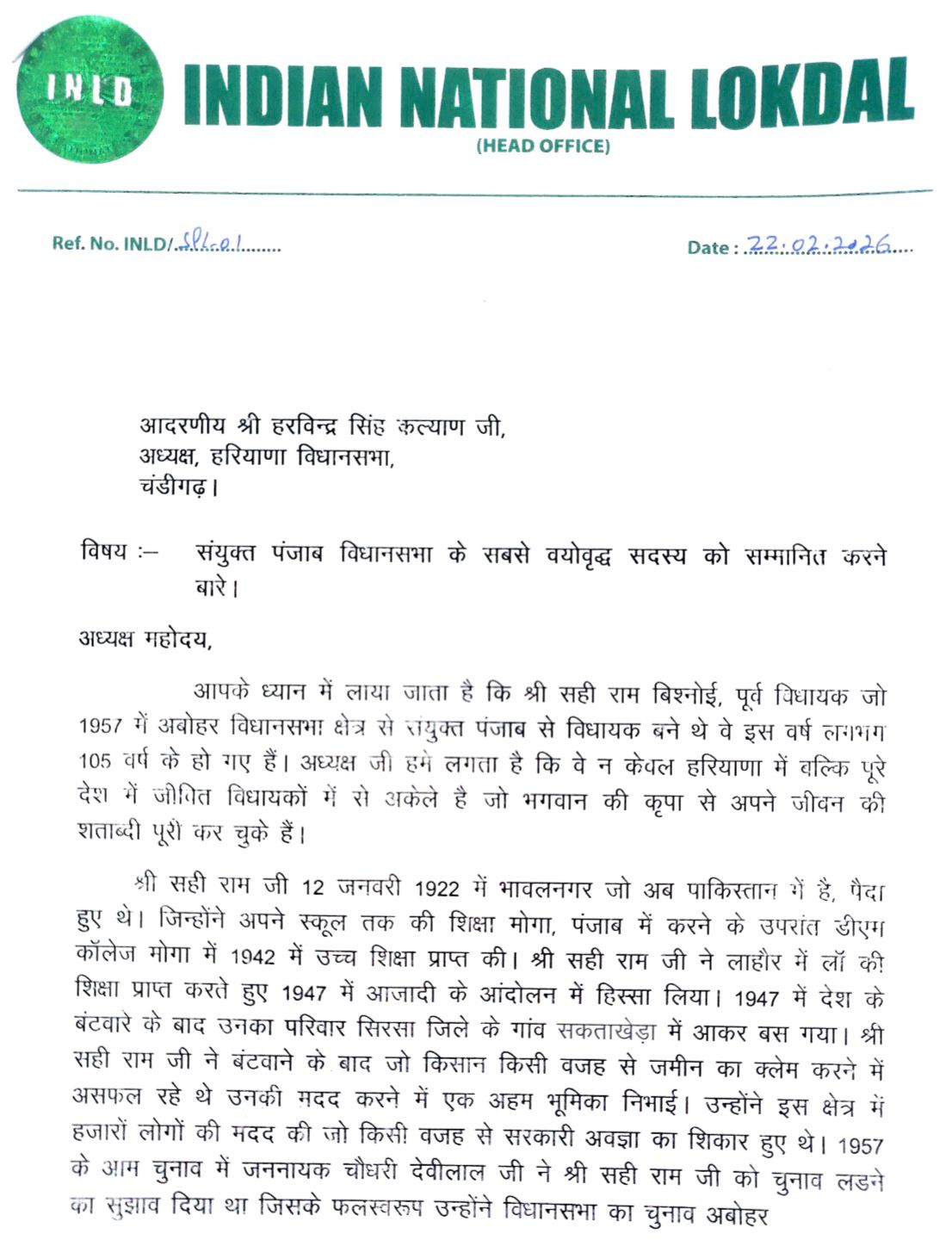 इनेलो के राष्ट्रीय अध्यक्ष चौधरी अभय सिंह चौटाला की अनुशंसा पर संयुक्त पंजाब विधानसभा के सबसे वयोवृद्ध सदस्य श्रीमान सही राम बिश्नोई जिनकी आज आयु 105 साल की हो गई है उनको विधानसभा के नियमानुसार विशेष आयोजन के तहत उचित मान सम्मान देने के लिए एक पत्र विधानसभा स्पीकर को सौंपा