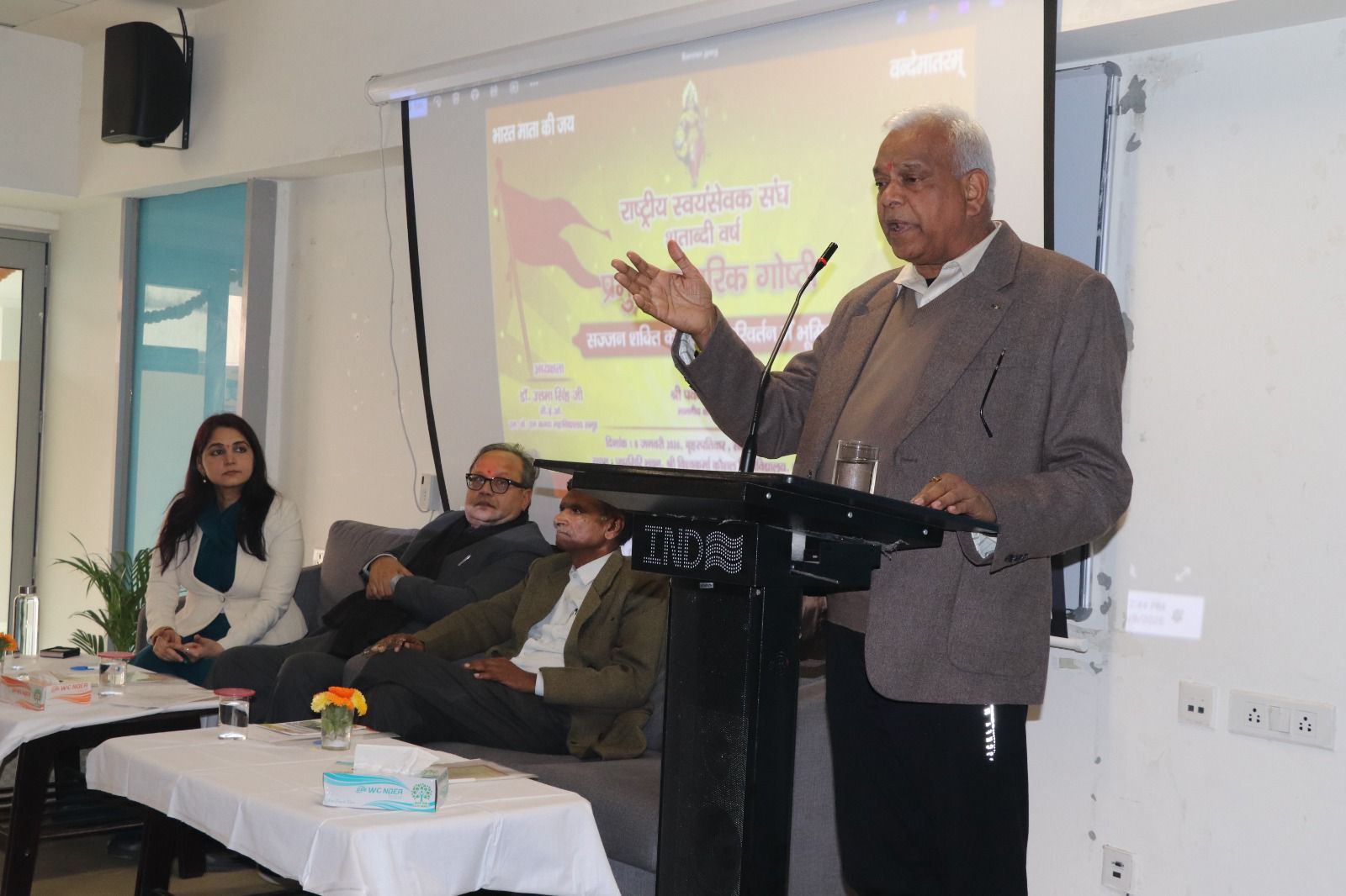 पुष्पगिरि भवन में आयोजित गोष्ठी को सम्बोधित करते हुए क्षेत्र संघ चालक पवन जिंदल ने कहा कि राष्ट्रीय स्वयंसेवक संघ ने राष्ट्रीय चेतना को न केवल जागृत किया है, बल्कि उसे समृद्ध भी बनाया है। समाज को एक दृष्टिकोण भी दिया। उन्होंने कहा कि हमें इतिहास ठीक से नहीं पढ़ाया गया। सिकंदर महान नहीं था बल्कि वीर शिवा जी महान थे जिन्होंने 270 से अधिक युद्ध लड़े और किसी में भी नहीं हारे। क्षेत्र संघ चालक पवन जिंदल ने राष्ट्रीय स्वयंसेवक संघ की सौ वर्ष की विकास यात्रा का भी क्रमवार उल्लेख भी किया। उन्होंने कहा कि भारत हर दृष्टि से महान राष्ट्र है।
