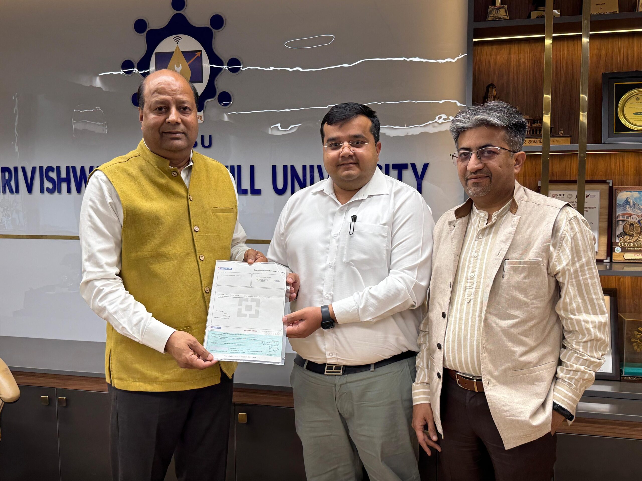 Palwal News: मुकेश बघेल, ब्यूरो चीफ, पलवल। श्री विश्वकर्मा कौशल विश्वविद्यालय स्किल इनोवेटर्स फाउंडेशन ने अडानी विल्मार से सीएसआर के अंतर्गत 28 लाख रुपए अर्जित किए हैं। फॉउण्डेशन के मुख्य कार्यकारी अधिकारी गौरव सिंह ने मंगलवार को कुलगुरु प्रोफेसर दिनेश कुमार को 28 लाख रुपए की राशि का चेक सौंपा। कुलगुरु प्रोफेसर दिनेश कुमार ने इस उपलब्धि के लिए उन्हें बधाई दी। उन्होंने कहा कि एसएसआईएफ निरंतर प्रगति पथ पर अग्रसर है। यह राशि शिक्षा और समाज उत्थान पर खर्च होगी। कुलगुरु प्रोफेसर दिनेश कुमार ने बताया कि हरियाणा के युवा सशक्तिकरण एवं उद्यमिता मंत्री श्री गौरव गौतम की प्रेरणा से यह राशि विभिन्न परियोजनाओं पर खर्च की जाएगी।