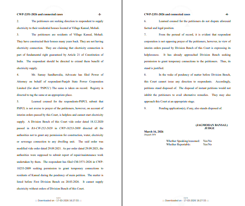 * बिजली निगम (PSPCL) की मजबूरी: निगम ने स्पष्ट किया कि हाई कोर्ट के पुराने अंतरिम आदेशों के कारण वे इस क्षेत्र में बिजली, पानी या सीवरेज जैसी सुविधाएं देने में असमर्थ हैं और इस पर अब हाल ही के 18मार्च 2026 के सिंगल बेंच के आदेश के कारण और करारा झटका लग गया है हालांकि, निगम ने हाईकोर्ट से कांसल निवासियों के लिए ‘अस्थायी कनेक्शन’ की अनुमति मांगी थी जो मैंने हाईकोर्ट ख़ारिज कर दी है।